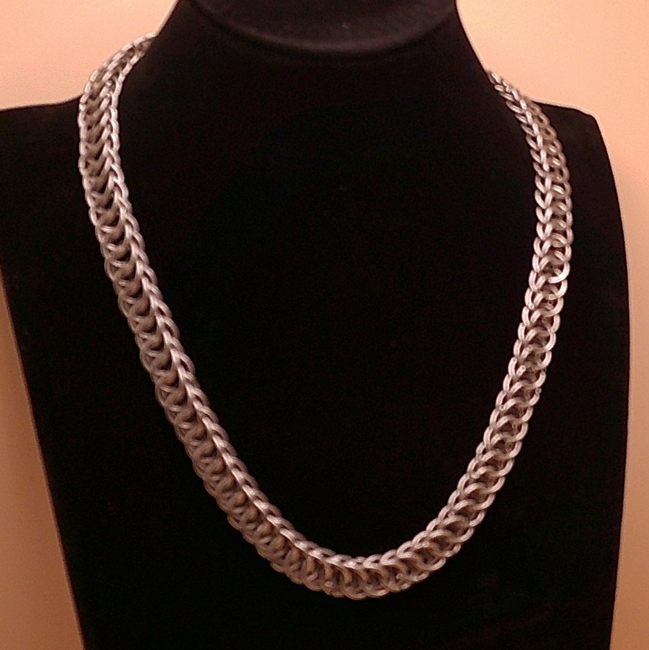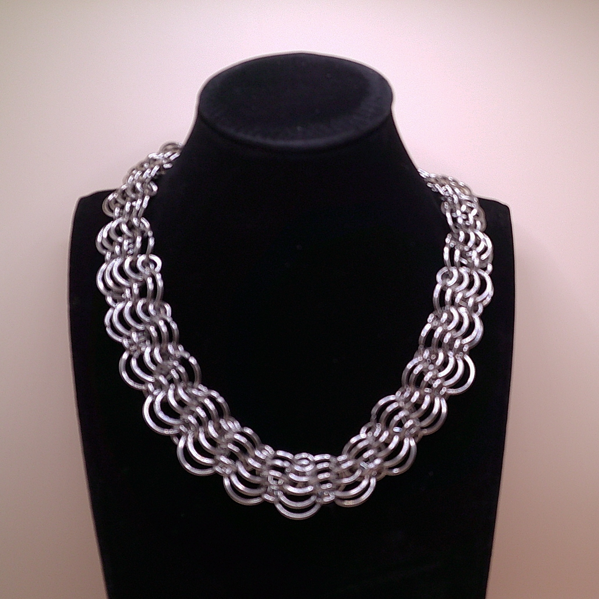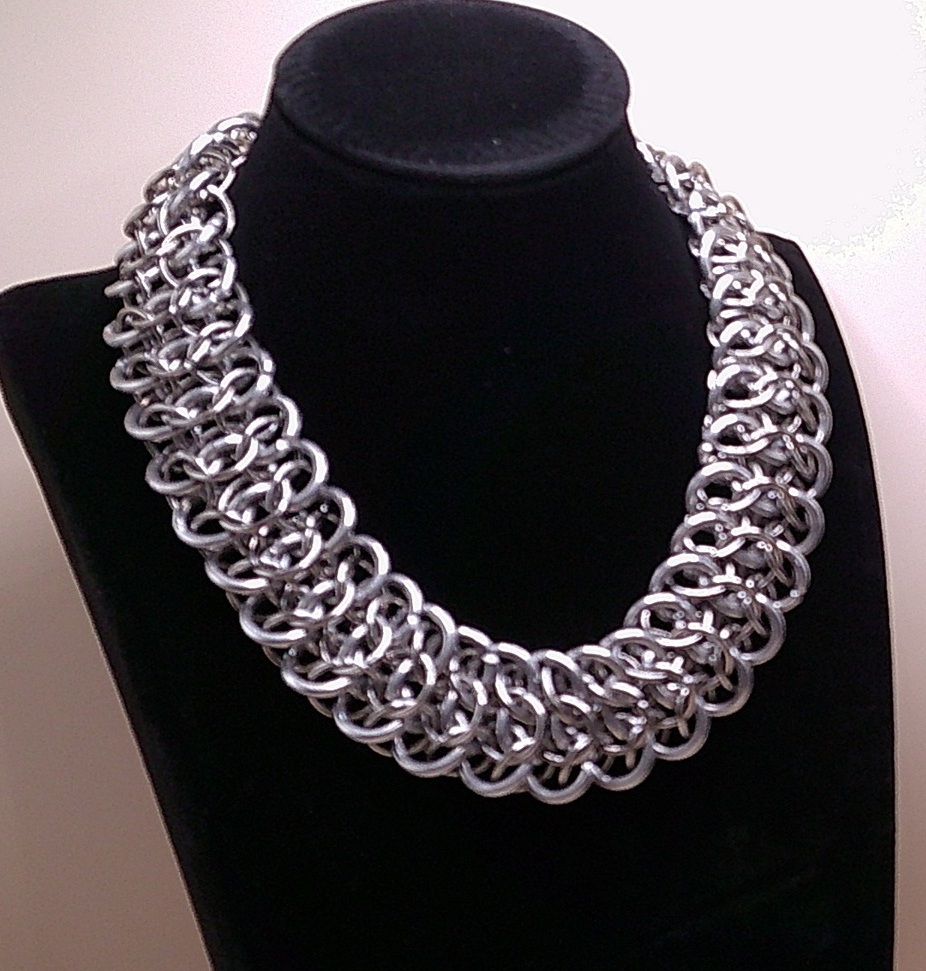 This is a beautiful mix of Aluminum and Stainless Steel, with the Stainless woven through the structure of the Aluminum in the most intricate fashion possible. Choker length 14″ with small clasps -16″ with large clasp. Matching bracelet.