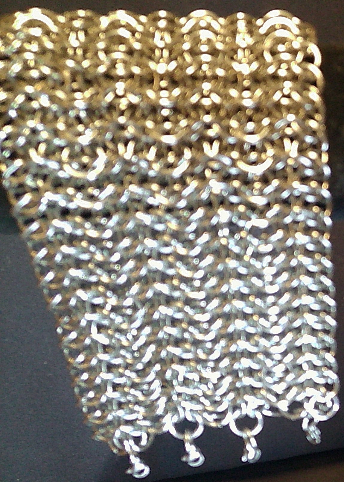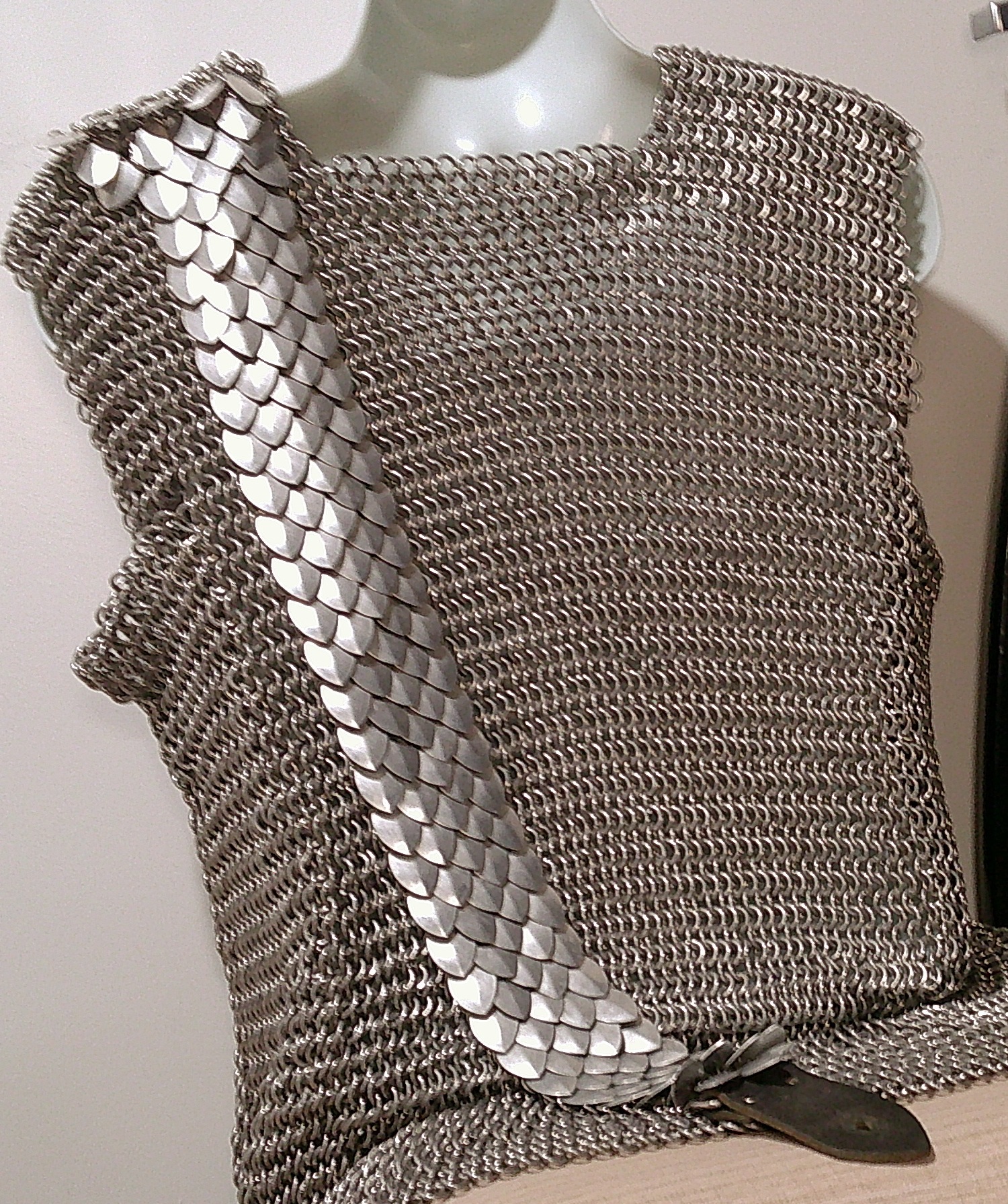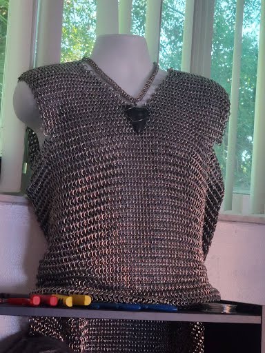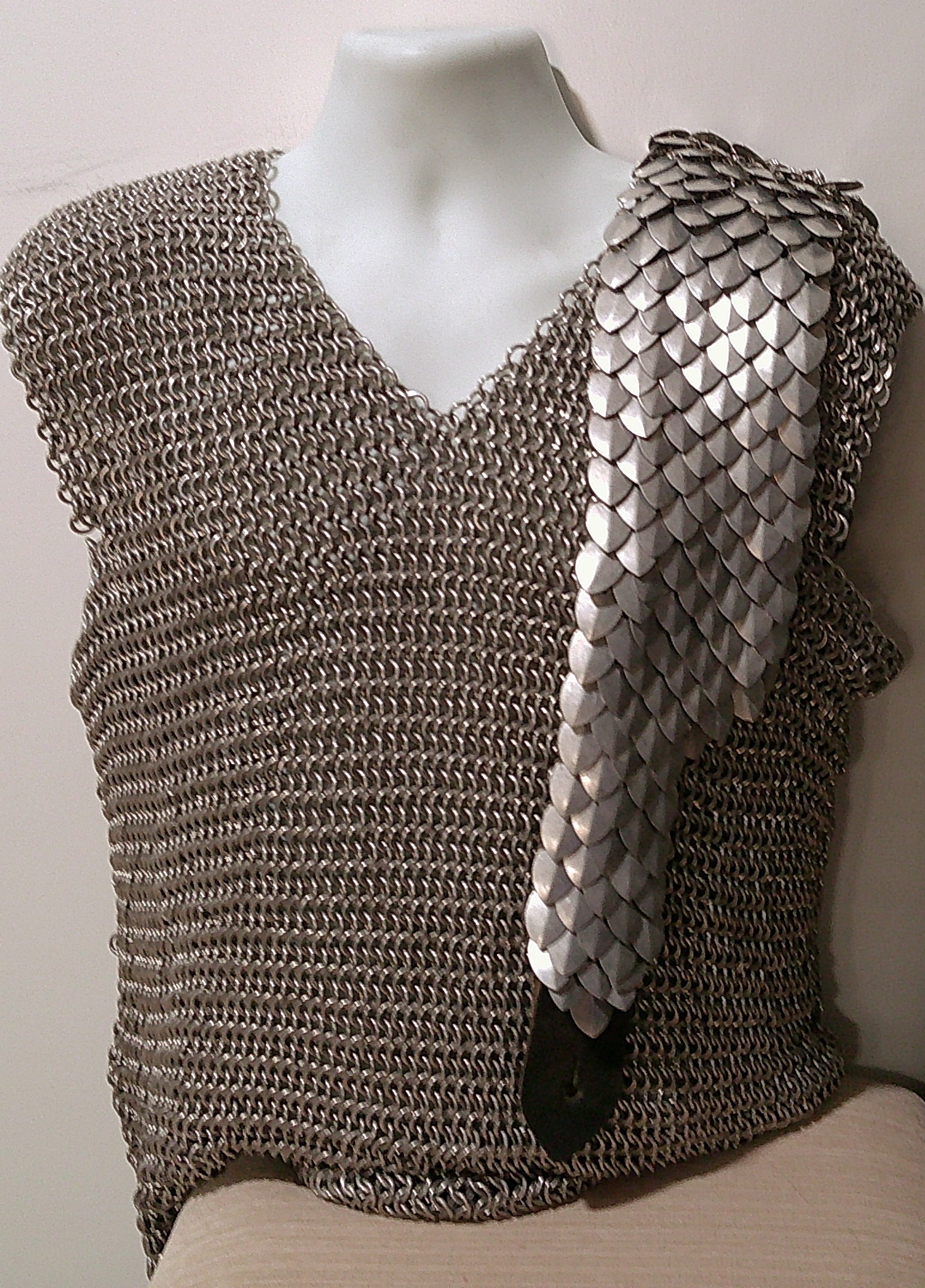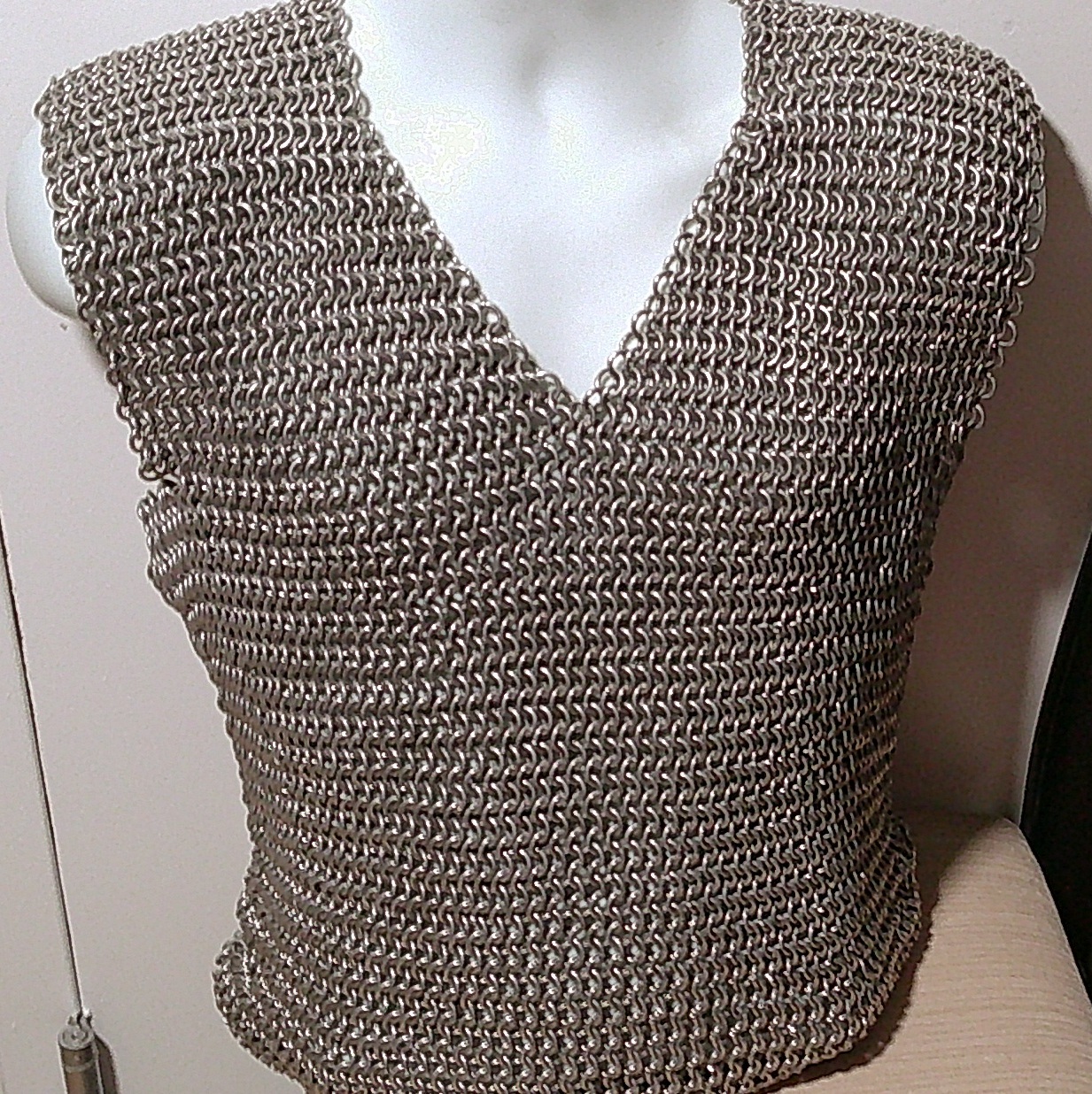 The sleeveless ‘Lorica Hamata’ design of chainmail vest was used between the years 300-27 B.C.E. Made of iron or bronze, with short sleeved versions used until 400 C.E., and with even longer variations used until the late 1500’s. This version uses a larger calculated thickness aluminum to achieve a greater strength than steel, though the rings are butted, and not welded for combat. This increased thickness also reduces the size of the holes between rings to the point that you can’t see through it when worn. Even though the aluminum is much thicker, it is still only about 2/3 the weight of what a Steel version would have been at 11 lbs instead of 17 lbs.