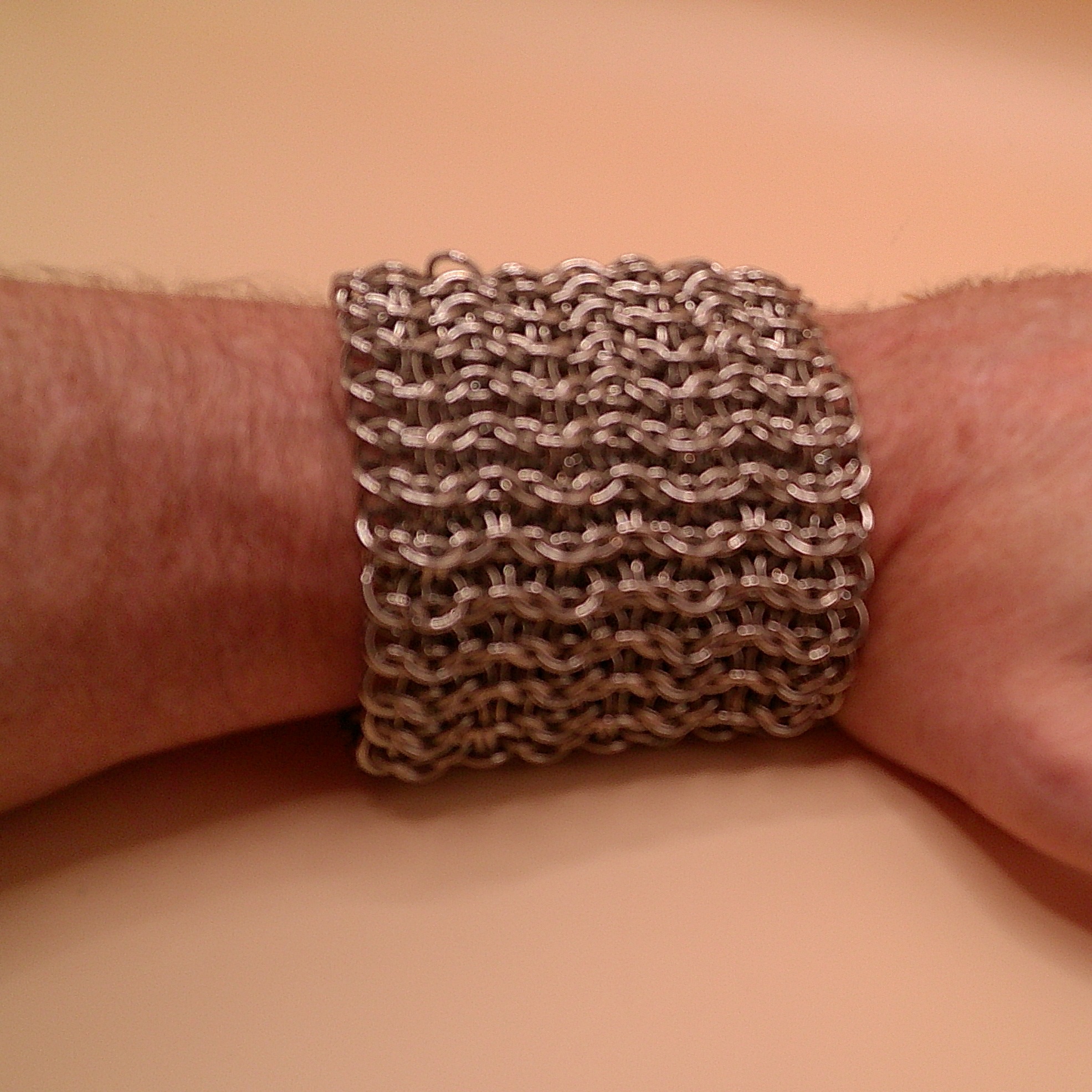 This extremely tightly Interwoven quarter inch bracelet is quadruple width. The design forms waves, which run parallel to each other around the bracer. The multiple layers, combined with the dense Stainless Steel make this thicker and heavier than you might expect.